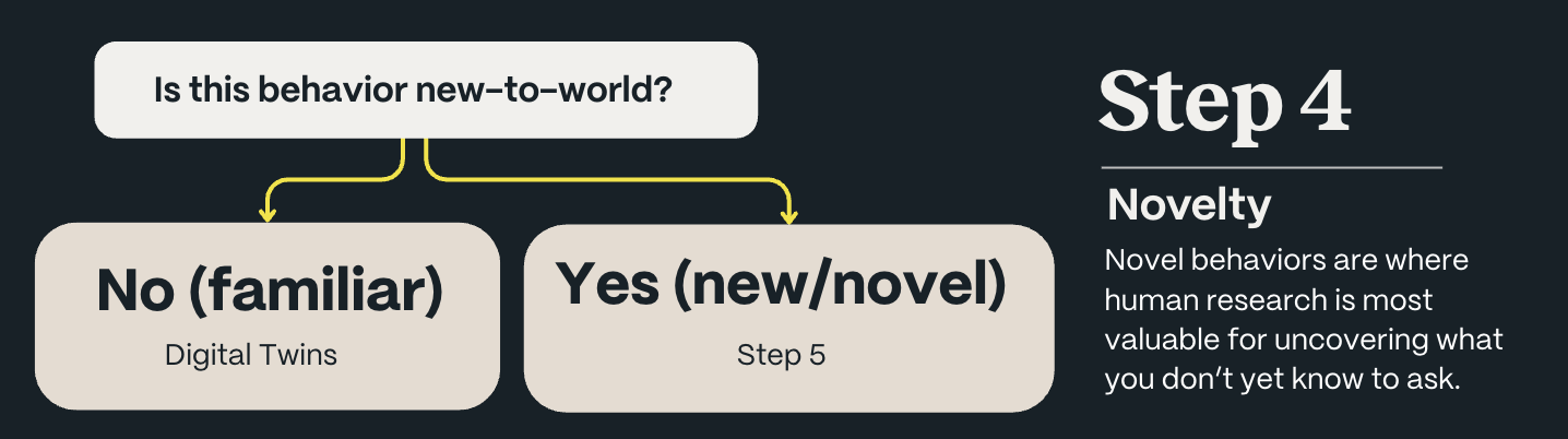 If you're asking people to imagine and respond to something genuinely new — a behavior that doesn't exist yet, a category that's never been defined, a product that requires consumers to change how they live — human research is where you need to start. Novel behaviors are where human curiosity and probing are most valuable for uncovering what you don't yet know to ask. A Digital Twin can't tell you what it's never seen.