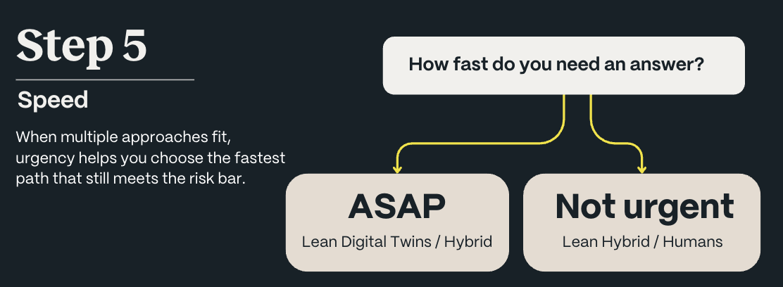 By the time you reach Step 5, you've already established that Digital Twins are appropriate for your data, stage, risk level, and behavior type. Now speed becomes the tiebreaker.