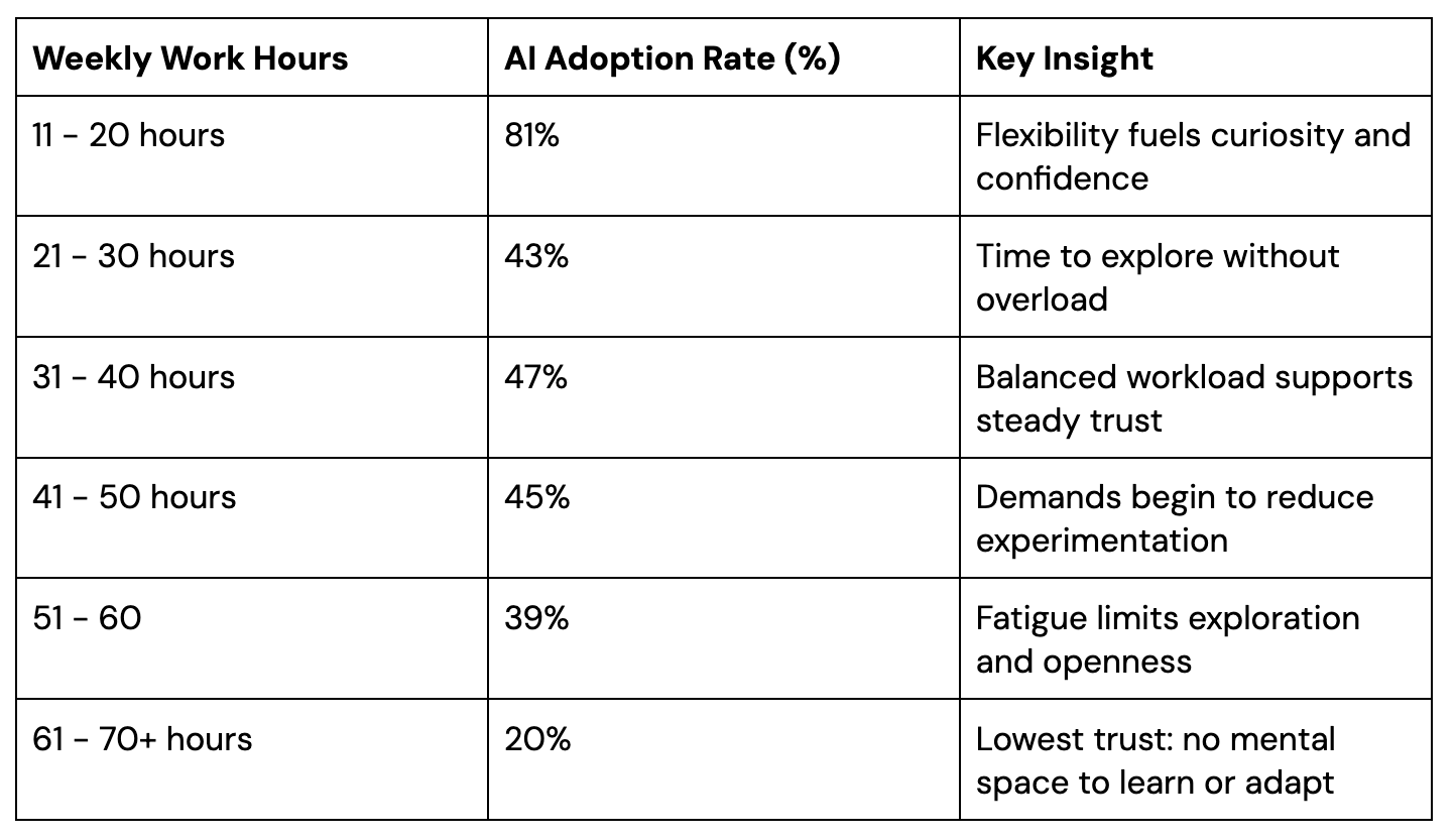 This finding reframes how we think about AI and time: it’s not the busiest who trust AI first, but those who have enough mental space to engage with it. Time scarcity doesn’t just reduce productivity; it erodes curiosity and trust. For innovators, the implication is clear: AI builds trust only when interaction feels effortless, not exhausting.